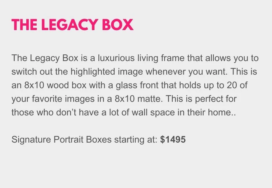 I believe your photographs are legacy pieces, destined to be admired and maybe one day passed down to future generations. They are meant to honor and celebrate who you are now and all that you’ve been through. No more images sitting forever on your computer or USB drive. Photographs are meant to be enjoyed, touched, and smiled at, and my ultimate goal with you is to figure out how you want to preserve these memories. Yes, you will still be able to have those images on a USB but you will also get those photographs printed and up on your walls or in an album- I promise